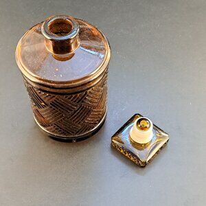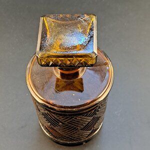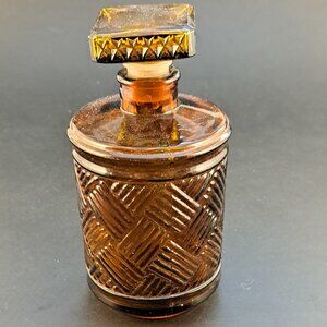 This vintage amber glass decanter is in good used condition. It stands roughly 5 inches tall without its matching stopper. Due to age and use, it has a few flea bites at the base and a small chip on the first ring above the base, but it is still a lovely piece that would add warmth and charm to your bar area.