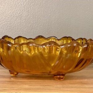 Add a warm, vintage touch to your table with this stunning amber glass serving bowl. Featuring a beautiful sunburst design at the center and a scalloped edge, this piece is both elegant and functional. Its rich golden-amber hue makes it a perfect statement piece for any retro or farmhouse-style decor.