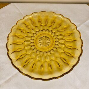 amber glass, serving plate, vintage glass, Indiana Glass, sunburst plate, scalloped dish, entertaining, retro decor, hostess gift, glass platter, warm amber, pressed glass, tableware, mid-century style, holiday serving, gift, holiday serveware