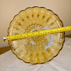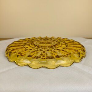 Beautiful vintage amber glass serving plate featuring a scalloped rim, radiating petal-style pattern, and a sunburst centre. Measures 10" (25.4 cm) across. Likely made by Indiana Glass, known for their richly coloured pressed-glass entertaining pieces from the mid-20th century.