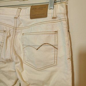 Bring back the 90s with these American Eagel Outfitters vintage corduroy pants. The pants are an off-white or cream colour with brown stitching.The hem is flared.
