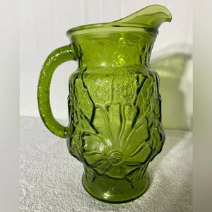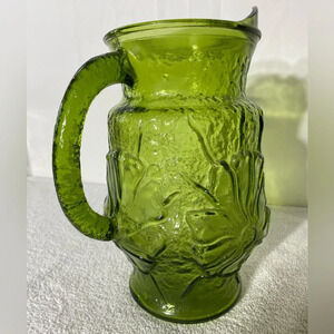 Vintage Anchor Hocking Avocado Green Textured Rain Flower Glass Pitcher