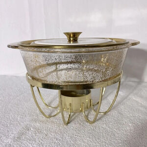Vintage Anchor Hocking Fire King Gold Fleck Casserole & Stand Georges Briard Lid