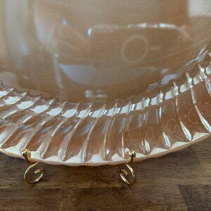 This stunning vintage peach luster Fire-King platter by Anchor Hocking is a glowing example of mid-century American glassware. Featuring a rich iridescent finish and elegant ribbed border, this large oval platter is both eye-catching and functional—perfect for serving or displaying. A beautiful statement piece for collectors or retro entertainers!