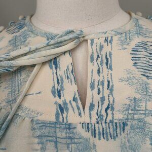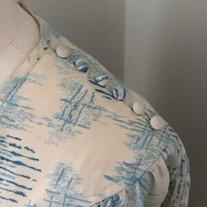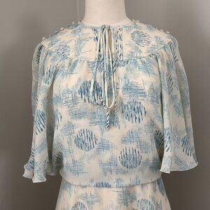 Vintage Ann Michael abstract print dress with button accents along top of shoulder, tie at neckline, loose fit body, elasticized waistband with soft and feminine open flutter sleeves and a-line style skirt. Midi length in a beautiful off white/cream base with blue abstract print.