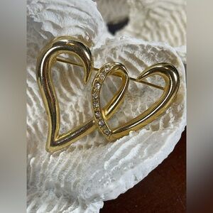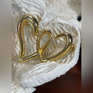 Vintage Anne Klein II Gold Plated Double Heart with Crystal Brooch