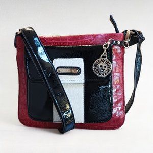 Vintage Anne Klein Red Crocodile Reptile Embossed Black Patent Leather Vegan Crossbody, circa '90s. Top zipper entrance. The front pocket has a flap closure with a magnetic closure Red fabric interior featuring one zippered and two slip pockets. Clean and includes a lion head medallion purse charm, adjustable crossbody strap, and extendable sides when unzipped. Purse in excellent condition, slight peel mark inside zippered area on side. Cant be seen when in use, please see last picture.. Smoke free, pet friendly home. Fast shipping usually within 24 hrs. Vegan faux leather. Measures approximately 10" x 8" Always open to fair offers. Bundle items and save with combined shipping rates.