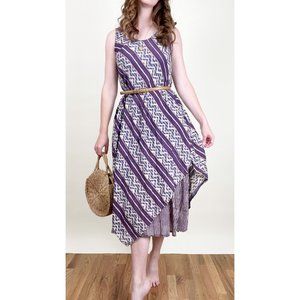 Stunning vintage lagenlook relaxed fit midi dress by Anokhi for Sarah Clothes. This dress features a relaxed sleeveless silhouette, crew neck, side pockets, and asymmetrical hem. Absolutely perfect piece for year-round wear! This beautiful dress can be worn to weddings, picnics in the park, baby showers, garden parties, date nights, drinks with friends, or on a romantic getaway vacation. Guaranteed to get you so many compliments when you wear this piece!