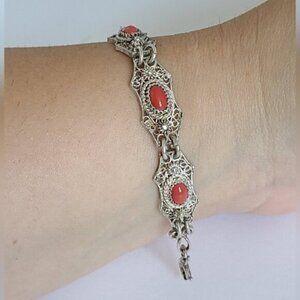 Vintage Antique Boho Sterling Silver Red Orange Coral Cabochon Filigree Chain Bracelet