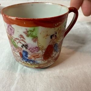 Vintage Antique Japanese Geisha Ware red porcelain demitasse cup & saucer. It is a beautiful small cup and saucer set hand-painted. Size: Plate: 5” in diameter cup: 2.5” high. Pre-owned, very old, please check the pictures.