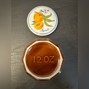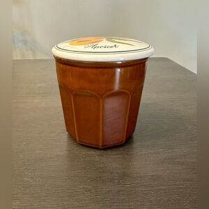 Vintage Gailstyn Sutton ceramic 12 oz jam preserve marmalade jar. The lid has an apricot graphic and says “Apricot”. Brown base with cream/white lid. In excellent used condition. Approximate Measurements: 4" Tall 4" in diameter