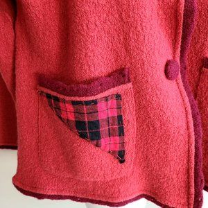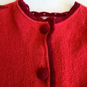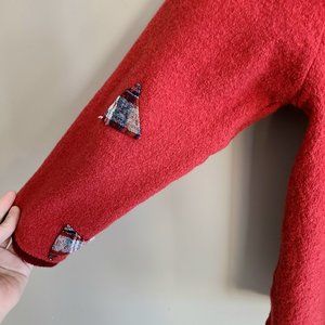 Vintage April Cornell red 100% wool sweater/cardigan with applique design.