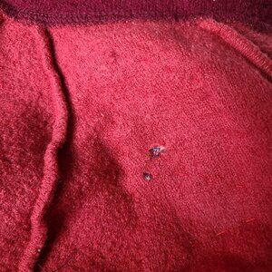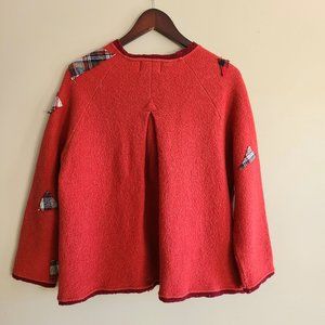 Vintage April Cornell red 100% wool sweater/cardigan with applique design. Size Small. Please see measurements at the photos. There is hole inside the sweater underneath the patch work. Sweater might have some shrinkage. Priced accordingly.