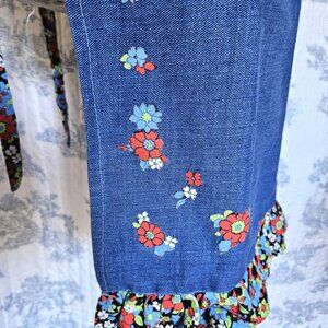 Vintage apron in a medium to heavy weight cotton denim fabric, slightly stiff. Floral cotton ruffle at bottom, front pleats, floral appliques (appliques looked glued on).