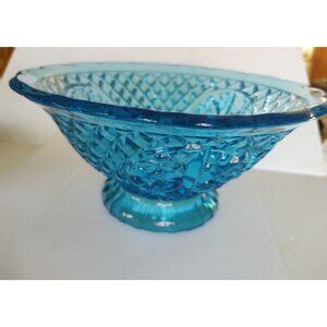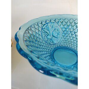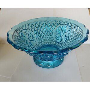A vintage cornflower blue waffle Della Robbia fruit panel glass console bowl aqua blue color, a waffle texture on its surface, and a Della Robbia-style fruit panel design in relief. It would have been created in the mid-20th century and intended for display on a console or similar piece of furniture. It's uses can vary from a salad bowl to a punch bowl..