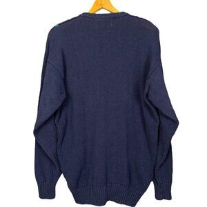This vintage Archie & Brown Son sweater features a classic argyle pattern in bold green and red against a navy blue background. Made from 100% cotton, this lightweight knit is softer and more breathable than traditional wool, making it a versatile piece for year-round wear. The v-neck design adds a refined touch, while the ribbed cuffs and hem provide a comfortable fit.