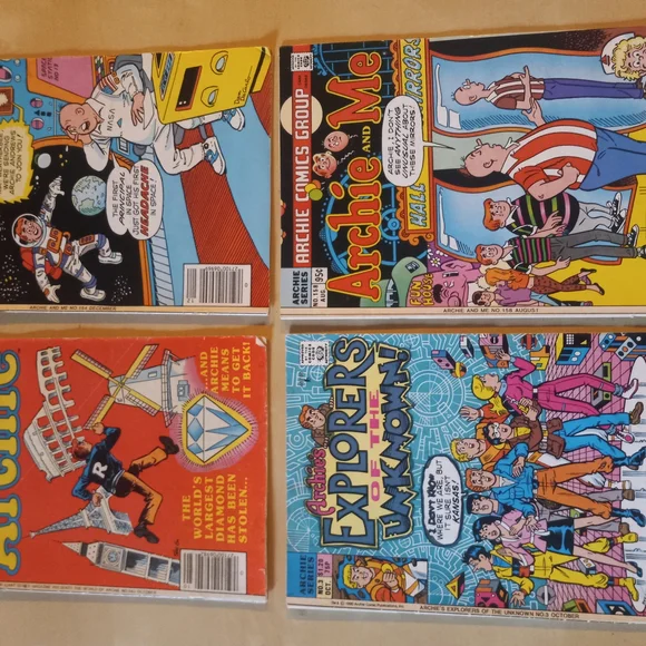 Set of four vintage Archie comic books. Colorful covers with classic illustrations. Perfect for collectors.
