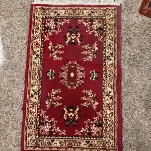 Beautiful area rug. I’ve washed it well. There’s one corner of it that’s faded and another flaw on one part of the edging. Please see photos. Tassels are in great condition. 23” x 36”. Color is a pinkish red. Looks more red in photos but is more of a pink hue.