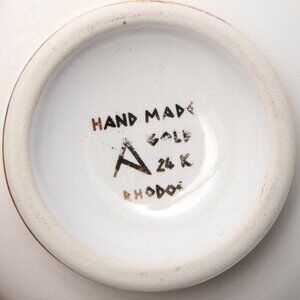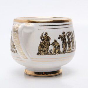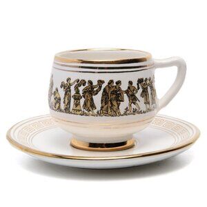 Indulge in the timeless elegance of the Vintage Greek Arguros 24K Gold Ceramic Cup & Saucer set, a masterpiece of craftsmanship and beauty. Handmade in Greece by skilled artisans, this stunning set is a true work of art, featuring a delicate ceramic cup and saucer embellished with 24K gold accents.