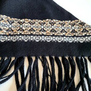 Beautiful vintage Arola triangle shape 100% wool black shawl with white and orange pattern and tussles. Made in Finland.