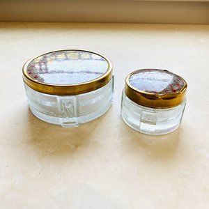 Two stunning pressed glass Antoine vanity or boudoir makeup/cosmetic jars with lids. Gorgeous!