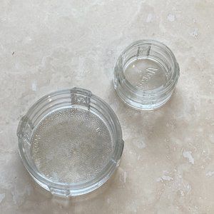 Both bear the same design: thick, pressed glass with four raised glass floral (tulip) designs and bands of ribbing. The lids have a gold tone metal rim.