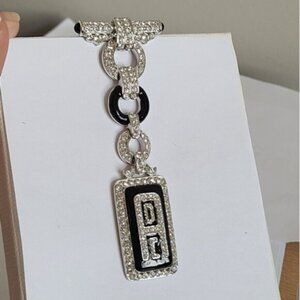 Vintage 80s Art Deco Style Boho Silver Tone Drop Black Enamel Clear Rhinestone Brooch
