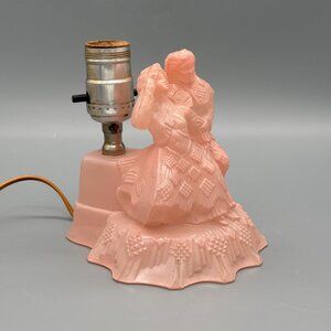 This vintage frosted pink glass boudoir lamp by Portable Electric features a sculpted Art Deco couple rendered in soft pastel tones, creating a charming decorative accent ideal for a vanity, bedside table, or display shelf, with its stylized form adding nostalgic beauty and character to any space.