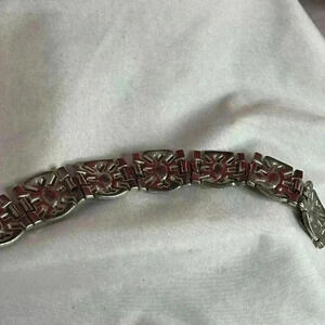 From my Collection, beautiful Circa 1930's bracelet.Made from pot metal with glamorous and sparkling pave rhinestone design, accented by blue marquise stones. Measures 1" wide x 7.25" long with closed. Closure is secure and tight.great workmanship and quality, over 100 years old and still in unbelievable condition.!!