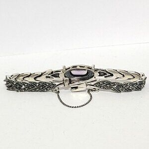Vintage Art Deco Boho Sterling Silver Purple Amethyst Marcasite Crystal Link Bracelet with chain clasp
