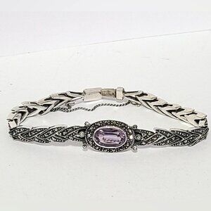 Vintage Art Deco Sterling Silver Purple Amethyst Marcasite Crystal Bracelet