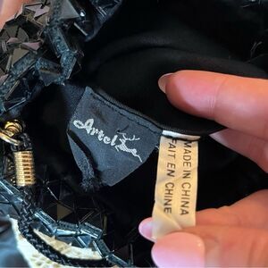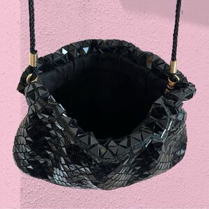 Beautiful vintage Artel evening bag. Geometric triangle metal pieces that are similar to glomesh. The strap is a thin black rope. Gold hardware, the opening is a hidden metal hinge. Excellent condition.