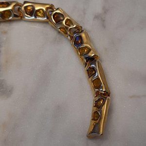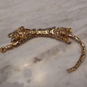 1980's Vintage Articulated Over The Shoulder Leopard Brooch Gold Tone With Amber Stones for the body and green stones for the eyes. There are 15 joints from head to tail, a couple of extra on the front arms, and 2 pins, 1 at the shoulders, the other at hips. This brooch can be worn over the shoulder, draped around a scarf or many other creative ways. It measures 8.25” long and about 1” at the shoulders and hips. Please see photos for more details. Excellent condition.