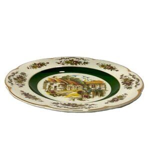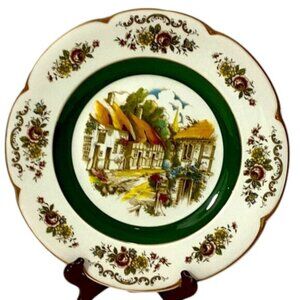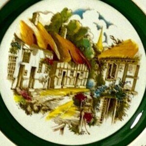 Plate features thatched English cottages during summertime with gold trim around the edges.