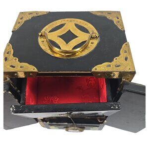 vintage jewelry box, Asian lacquer chest, oriental home décor, brass hardware, mother-of-pearl inlay, Chinese double happiness, abalone inlay, collectible vanity box, mid-century decorative box, antique storage chest