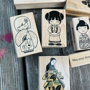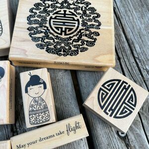 Set of wooden stamps with Asian designs. Features elephant, traditional figures, and symbols. Ideal for crafting.