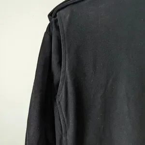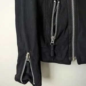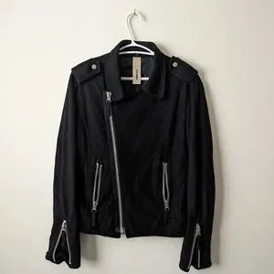 Vintage Attatchment classic black moto-style jacket. Silver hardware and zipper details. Structured collar and epaulets. Sleek, versatile outerwear.