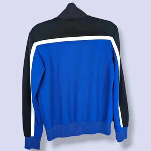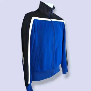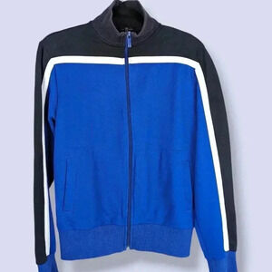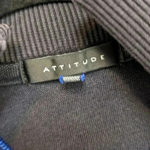 This vintage full zip sweater by Attitude is made of a poly/cotton blend (62%/38%) in black and blue with a white stripe accent. The jacket has two front pockets and a thick elastic on the bottom hem, the sleeve cuffs, and around the neck. The black elastic around the neck has faded somewhat with time and wear, but does not affect the wearability of the piece.