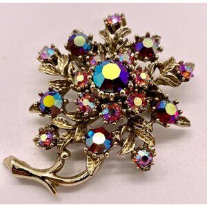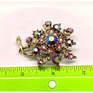Vintage Aurora Borealis Floral Brooch, Iridescent Rhinestone Flower Pin, Antique