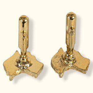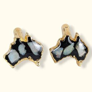 These vintage cufflinks are made of a gold tone metal and have toggle backings. Each cufflink is shaped like the country of Australia with a thick gold frame. The interior of each has 3 small pieces of white stone, though I can't tell what kind or if it's natural or synthetic as it's all under a clean resin of some kind. Opal? MOP? Those are my best guesses. There is normal wear throughout the cufflinks, but no issues affecting wearability.