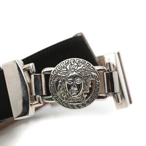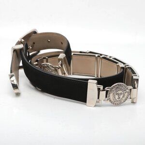 Elevate your ensemble with a touch of luxury and sophistication with the Vintage Avanti Leather Medusa Head Belt. Made in Italy, this statement piece features a sleek black leather band adorned with intricate metal silver toned hardware. The iconic silver chain detailing adds a glamorous touch to any outfit, making it a versatile and timeless accessory for any wardrobe.