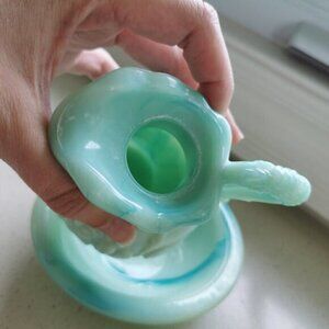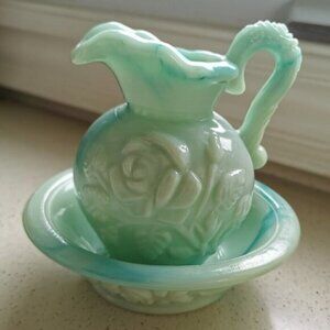 Vintage Avon Blue Roses Glass Mini Pitcher and Dish, Victoriana Jadeite Milk