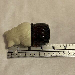 A white plastic cat (the lid) sits in a brown glass basket (the container). Screw top lid.The cream is no longer in the container, a scent does remain