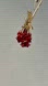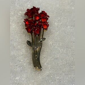 This exquisite brooch features a bouquet of flowers with deep red enamel petals and a shiny gold-toned stem. The slightly curved design and intricate leaf details add a natural elegance to this jewelry piece.
