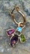 These vintage Avon gold-tone hoop earrings feature a colorful floral cluster dangle accented with jewel-tone stones in purple, pink, green, and aqua blue (amethyst, peridot, aquamarine, fuchsia look). The small hoops give a classic frame while the dangling cluster adds playful sparkle and movement.