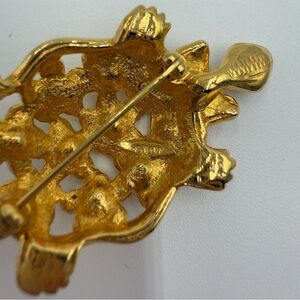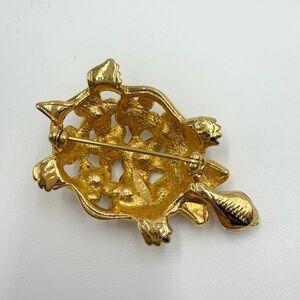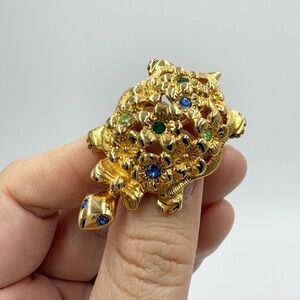 Gorgeous gold tone turtle brooch with colored rhinestones.