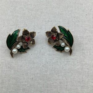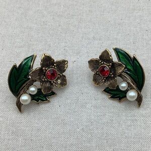 These exquisite Avon earrings showcases a captivating floral design, adorned with gold and green accents. The intricate metalwork and vibrant colors make it a standout piece, perfect for adding a touch of elegance to any ensemble. From 1992 and called Rich Christmas probably the most beautiful seasonal pieces Avon ever made. The pierced earrings are 1 and 1/2” long.