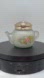 The teapot is made of frosted glass with a detailed floral bouquet featuring a large rose on the front. It has a gold-toned plastic lid.