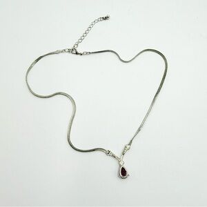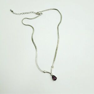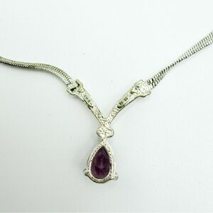 This vintage Avon necklace features a silver-tone design with a stunning faux amethyst glass stone, accented by sparkling rhinestones. A timeless and elegant piece perfect for any jewelry collection.