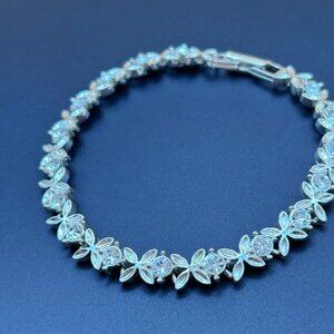 This vintage rhinestone bracelet from Avon features a lovely floral vine design in silver-tone metal. Clear rhinestones form small flowers linked together in a flowing, elegant pattern. The style closely resembles a classic tennis bracelet, offering continuous sparkle along the wrist.